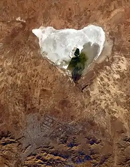 Miqan Wetland is a wetland located in Markazi province,[1] Iran. In years with good rainfall, the wetland has significant water level and in the years with less rain, the surface of the wetland generally dries and becomes a desert. The height of the wetland is 1700 meters above sea level and the water inside of it varies in different seasons. Miqan is supplied from different water sources such as rainfall, water of three rivers known as Qarah Kahriz (Koohrood) River, Farahan River, Shahrab River, and Arak ‘s wastewater treatment sewage. The area of the wetland is about 25,000 hectares,[2] which includes a lake with three islands in the middle and the surrounding plains. Archaeologically, the wetland's formation dates back to the Paleocene, which was due to the movement of the surrounding tectonic plates of the earth.[3]