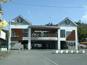 The station consists of one side platform serving a single bi-directional track. It originally was constructed with two opposed side platforms, and the remains of the abolished platform remain in situ. The station building has two floors, with rest rooms and taxi company offices on the first floor, and a multipurpose hall on the second floor. However, as a passenger station, it is unattended.[2]