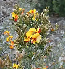 Mirbelia oxylobioides, commonly known as mountain mirbelia[2] or sandstone bushpea,[3] is a species of flowering plant in the family Fabaceae and is endemic to south-eastern Australia. It is a low-lying or erect shrub with narrowly elliptic to egg-shaped leaves and orange-yellow and reddish-purple flowers arranged near the end of the branches.