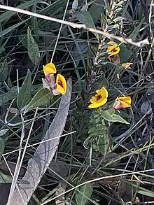 Mirbelia platylobioides is a small, scrambling, prostrate plant with soft, hairy stems to about 40 cm (16 in) long. The leaves are narrow-oval to oval shaped, stiff, 15–40 mm (0.59–1.57 in) long and 5–15 mm (0.20–0.59 in) wide, upper surface shiny and veined, silky-hairy below, arranged opposite or alternate ending in a point at the apex. The flowers are more or less sessile borne in small groups or rarely singly in leaf axils or at the end of branches. The corolla 14–18 mm (0.55–0.71 in) long, yellow to orange with a red centre, calyx, 7–9 mm (0.28–0.35 in) long with soft, silky hairs, lobes tapering to a point more or less equal to the length of the floral tube. Flowering occurs in spring and the fruit is a pod 15–20 mm (0.59–0.79 in) long, compressed with silky hairs.[2][3]