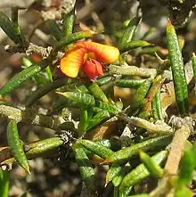 Mirbelia pungens, commonly known as prickly mirbelia,[2] is a species of flowering plant in the family Fabaceae and is endemic to south-eastern continental Australia. It is an erect or prostrate shrub with sharply-pointed linear leaves and orange-red flowers with blue or purple markings.