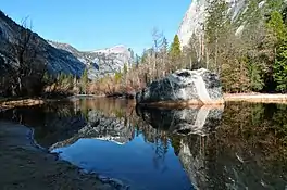 Mirror Lake is a small, seasonal lake located on Tenaya Creek in Yosemite National Park. Situated in Tenaya Canyon directly between North Dome and Half Dome, it is the last remnant of a large glacial lake that once filled most of Yosemite Valley at the end of the last Ice Age, and is close to disappearing due to sediment accumulation.