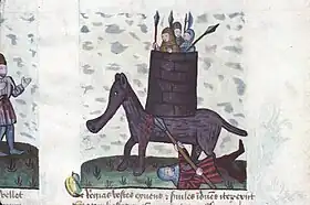 Miniature from a manuscript Speculum. Eleazar Maccabeus kills the elephant and is crushed.