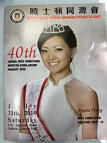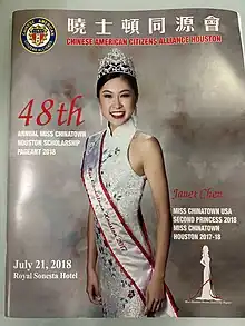 - ↑ ""Houston Lodge CHinese American Citizens Alliance 46th Annual Miss Chinatown Houston Scholarship Pageant 2016"".