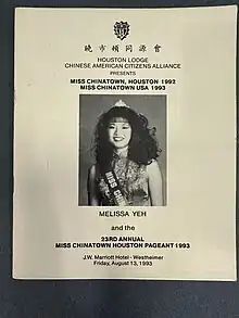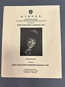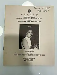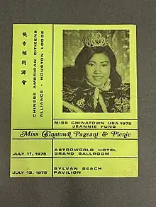 - ↑ "Houston Lodge Chinese American Citizens Alliance Miss Chiantown Houston Pageant 1984".