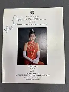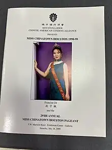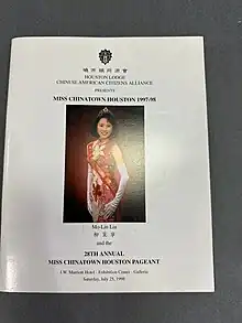 - ↑ "Houston Lodge Chinese American Citizens Alliance 30th Annual Miss Chinatown Houston Pageant Program". 2000.