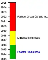 The Miss Grand Canada was organized as a stand-alone pageant three times; in 2017 and 2018 by the Di Benedetto Model agency,[13][14][18] and the online pageant in 2021 by the MTC-W Inc.[17]