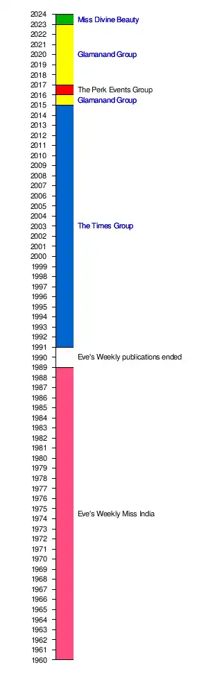 In 1989, Eve's Weekly's magazine publications ended, and hence they could not continue their pageant subsequently. There were no representatives from India at Miss International in 1989 and 1990.[4]