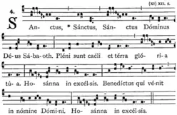 In the Sanctus Palestrina quotes the same chant melody (from the Gregorian Mass XV) as in the Missa Papae Marcelli; the movement's opening also resembles the melismatic Sanctus of that mass. A comparison of the two melodies is shown at right.