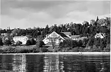 In 1882, Alanson Sheley (1809–1892) had two cottages built on Mission Point east of the Mission House (then the Mission House Hotel). A cottage was built by Robert Doud; today's Mission Point Theater was built to the west of its site (below). The second was Cedar Point cottage, located in the courtyard just northeast of today's Great Hall (below). When Sheley died, Cedar Point cottage, which had served as a summer cottage for the family, went to the Brooks family. The cottage built by Doud went to the Clark family, who later sold it to the Faren family, when it became known as the Faren Cottage.[16][17] In 1948, Rev. Norman Schwab purchased Faren Cottage. He had recently sold his family's Small Point home in Maine, and called the cottage Small Point.[18] Small Point became the family's principal residence year round. In 1959, the Schwab family donated the land on which their cottage stood to the Moral Re-Armament (MRA) group. It planned to use the land for construction of a film studio. The cottage was winterized and transported to a site west of Robinson's Folly. Small Point cottage served as a residence for the Schwab family and several other families for many years. In 1971, John and Lois Findley moved to Mackinac Island to teach at the local school. They rented Small Point and purchased it in 1973. They operate Small Point as a bed and breakfast.[18][19]