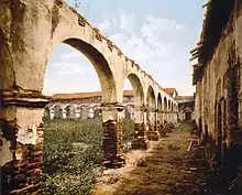 Thereafter, the Franciscans all but abandoned the Mission, taking with them most everything of value, after which the locals plundered many of the Mission buildings for construction materials.[78] According to Bancroft, "The population of San Juan Capistrano in 1834 had decreased to 861 souls, and in 1840 it was probably less than 500 with less than 100 at the pueblo proper; while in its crops San Juan (Capistrano) showed a larger deterioration than any other (missionary) establishment."[71] By 1835, little of the Mission's assets remained, though the manufacture of hides and tallow continued in full swing as described in Richard Henry Dana's classic novel Two Years Before the Mast.[79] The Mission was declared to be "in a ruinous state" and the Indian pueblo dissolved in 1841.[80] San Juan Capistrano was officially designated by Governor Juan B. Alvarado as a secular Mexican town on July 29, at which time those few who still resided at the Mission were granted sections of land to use as their own.[81] Following this change in status, the area around the Mission began to decay rapidly; Santiago Argüello (then prefect of the southern District of Los Angeles) complained to the Commandant of the Presidio of Santa Barbara, Don José de la Guerra y Noriega, that "...the unfortunate missions of San Gabriel and San Juan Capistrano [have] been converted into brothels of the mayordomos.[82]