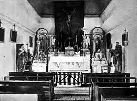On the afternoon of November 22, 1800, tremors from the 6.5-magnitude San Diego earthquake cracked the walls of the rising edifice, necessitating that repair work be performed.[50] Unfortunately, Señor Aguilár died six years into the project; his work was carried on by the priests and their charges, who made their best attempts to emulate the existing construction. Lacking the skills of a master mason, however, led to irregular walls and necessitated the addition of a seventh roof dome. The church was finally completed in 1806, and blessed by Fray Estévan Tapís on the evening of September 7; a two-day-long fiesta followed.[51] The sanctuary floors were paved with diamond-shaped tiles, and brick-lined niches displayed the statues of various saints. It was by all accounts the most magnificent in all of California and a three-day feast was held in celebration of this monumental achievement.