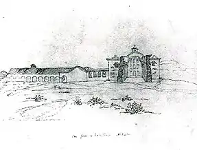 On December 14, 1818, the French privateer Hipólito Bouchard, sailing under the flag of the "United Provinces of Rio de la Plata" (Argentina), brought his ships La Argentina and Santa Rosa to within sight of the Mission; aware that Bouchard (today known as "California's only pirate") had recently conducted raids on the settlements at Monterey and Santa Barbara, Comandante Ruíz had sent forth a party of thirty men (under the leadership of a young Spanish lieutenant named Santiago Argüello) to protect the Mission at first news of the approach on the 13th.[55] Two members of Bouchard's contingent made contact with the garrison soldiers and made their demand for provisions, which was rebuffed with added threats: Lieutenant Argüello replied that if the ships did not sail away the garrison would gladly provide "an immediate supply of shot and shell".[56] In response, "Pirata Buchar" (as he was referred to by the Californios) ordered an assault on the Mission, sending some 140 men and two or three violentos (light howitzer cannon) to take the needed supplies by force.[57] The Mission guards engaged the attackers but were overwhelmed; the marauders looted the Mission warehouses and left minor damage to several Mission buildings in their wake, and reportedly set fire to a few of the outlying straw houses.[58] Reinforcements from Santa Barbara and Los Angeles, led by Comandante Guerra from El Presidio Real de Santa Bárbara, arrived the next day to no avail as the ships had already set sail.