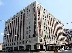 The hotel portion of the facility is a ten-story L-shaped brick and granite building surrounding the seven-story theater. The ten-story portion of the building is 119.51 feet (36.43 m) high.[9] Three passenger elevators provided access to the upper floors. All of the hotel rooms faced out from the outside of the "L." There were no interior facing rooms.[5] The verticality of the building is established by way of the vertically aligned windows that are separated by decorative panels. The Art Deco style is employed throughout the building, including the theater interior. Overall, the façade is void of excessive ornamentation. However, the stylized geometry indicative of the Art Deco style is found on the horizontal banding that defines the tenth floor. Decorative terracotta panels with a floral motif are also used to define the mezzanine level of the lower stories.[10]