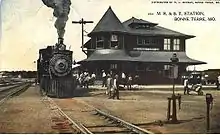 The Mississippi River & Bonne Terre Railway (M.R. & B.T.) was a single-track standard-gauge steam railroad that was located in southeastern Missouri and began service in 1892. It extended from Riverside in a general southwesterly direction to the lead-mining field in St. Francois County. The main stem, from Riverside to Doe Run, was 46.492 miles (74.822 km) long. Eight short branch lines had a total trackage of 17.418 miles (28.032 km). Sidings and spurs aggregated 30.664 miles (49.349 km), and all tracks owned 94.574 miles (152.202 km).[1]