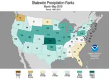 Wetter than normal conditions persisted into the spring with precipitation concentrated in the western and northern regions of the Mississippi River Basin. The conterminous United States recorded the fifth wettest meteorological spring (March 2019 - May 2019) during the 1895-2019 period of record, with an average of 9.92 inches (252 mm) of precipitation.[13] Kansas experienced its wettest meteorological spring receiving 14.31 inches (363 mm) of precipitation of which 10.51 inches (267 mm) fell in May.