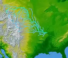 The Missouri River Valley outlines the journey of the Missouri River from its headwaters where the Madison, Jefferson and Gallatin Rivers flow together in Montana to its confluence with the Mississippi River in the State of Missouri. At 2,300 miles (3,700 km) long the valley drains one-sixth of the United States,[1] and is the longest river valley on the North American continent.[2][3] The valley in the Missouri River basin includes river bottoms and floodplains.