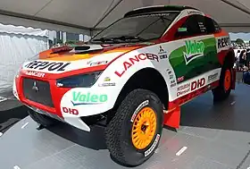 The Mitsubishi Racing Lancer (code-named MRX09) is a cross-country rally car developed by Mitsubishi Motors for competing in 2009 Dakar rally.[1] "MRX09" stands for Mitsubishi Rally X-Country.[1] The car was built to the FIA's Group T1 rules, and competed in the 2009 Dakar Rally.[1] It has a tubular steel frame with carbon fiber bodywork. Unlike previous Mitsubishi cross-country rally cars, the Racing Lancer's bodywork resembles the Mitsubishi Lancer Sportback instead of the Mitsubishi Pajero.[1][2]