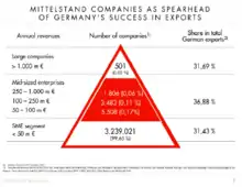 This pyramid shows that over 99% of German firms are Mittelstand firms but 0.34 depart from the classic small and medium-sized enterprise (SMEs) definition. The two categories of 'classic' and 'upper' Mittelstand firms in Germany account for 68% of Germany's exports. In comparison, Germany's larger corporations generate 32% of Germany's exports.[5] The 'upper'-sized Mittelstand firms (revenues between 50 million EUR and 1 billion EUR) form a unique and distinctive group, as they are the most export-oriented group of firms in Germany's business landscape contributing significantly to Germany's sustained export success. As such, Mittelstand firms clearly form the backbone of the German economy.[13]