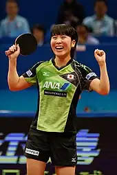 On 22 January 2017, she won All Japan Championships by defeating Kasumi Ishikawa 4–2 in the final at the Tokyo Metropolitan Gymnasium.[16] On 14 April 2017, she defeated the world ranked No.1 player Ding Ning at the 2017 ITTF Asian Table Tennis Championships.[17] The following day of the tournament, she defeated the world ranked No.2 player Zhu Yuling in the Semifinals [18] and Chen Meng world ranked No.5 in the Finals, where she set a new record for the youngest winner of the Asian Championships in the singles event. She became the third non-Chinese player ever and the first non-Chinese player since Chire Koyama in 1996 to win the singles title.[19]