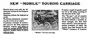Mobile's version of the steam carriage had a 5 to 12 horsepower engine, with a water tank range of about 35 miles and a gasoline tank range of between 60 and 75 miles. In 1901 kerosene could replace gasoline for fuel. Originally built as a light runabout, Mobile added up to 24 styles of bodies to improve poor sales. By 1902, a top speed of 50 mph was claimed. Prices for the Model 4 runabout started at $750 (equivalent to $25,367 in 2022) rising to a 9-passenger "coupe" Model 50 at $3,000 (equivalent to $101,469 in 2022).[2][1]
