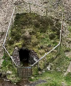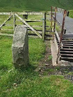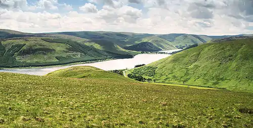 The north facing side of the Moffat Hills is bounded by a minor road (no road number on the Ordnance Survey map) which runs from Tweedsmuir village to St Mary's Loch, passing along the banks of the Talla Reservoir and the Megget Reservoir and rising to 450 metres by the Megget Stone.[5] The hills to the north here are called the Manor or Tweedsmuir hills[6] and the hills to the north west of the Moffat hills are called the Culters (pronounced Cooters). There is a third reservoir within the Moffat hills area called the Fruid[7] where two Bronze Age round houses[8] have been excavated in recent times and on the road from Tweedsmuir to the Fruid there are also standing stones.[9] In 1885 when the Talla dam was being built they put in a railway to help get construction materials to the site.[10]