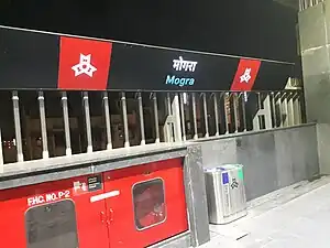 Mogra is an elevated metro station on the North-South corridor of the Red Line 7 of Mumbai Metro in Mumbai, India. This metro station was inaugurated on 20 January 2023 by Prime Minister Narendra Modi. [1][2][3]