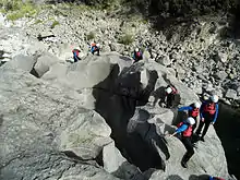 Moving closer to the grade V section, the boulders become larger and the banks narrow into a deep gorge. Large conglomerate blocks form the first rapid then the river eases into a sedimentary rock canyon. The boulders, while impressive in size, are even more intriguing because of the holes and depressions the water has carved into them. House rock worth a closer look; the center has been carved out and is accessible only by a hole in the side.[9] Fossilized shells and organic matter have been remarkably well preserved in the stones.