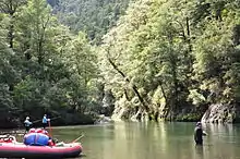 Up in the Kaweka range the Mohaka is a twisting grade II river with a bit of grade III. There are several Department of Conservation (DOC) campsites, hot pools and plenty of undisturbed native bush.[9] After approximately 36 km, it comes out of the Kawekas and farmland becomes more common[2] The river bends itself into an oxbow and shortly after rapids become larger as it leads into the grade III section. DOC campsites are still found along this 68 km stretch.[3]