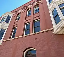 The 30,000-square-foot (2,800 m2) Moir Building stands as a three-story rectangular structure, crafted from brick and with sandstone, cast iron, and wood. The upper levels of this commercial and residential building are dominated by slanted bay windows and a rounded corner tower. The building's primary facade faces eastward, featuring architectural detailing. Its dimensions are 107 ft (33 m) in length by 76 ft (23 m) in width.[5] The building was completed in 1894 and designed by William D. Van Siclen.[1] Siclen was active as an architect in San Jose from 1892 until 1900.[9][3]