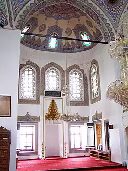 The mosque structure is built entirely in the Classical Ottoman Architectural tradition. The minbar or the pulpit in the mosque, is a unique special feature from where the imam addresses prayer meetings, which is embellished with kalem işi, polychrome wall paintings. The mihrab (niche) is also embellished in the same style as the minbar. There is a slim minaret built at the arcaded entrance, which has four domes. The mosque facing the street, has the minaret to its right corner. The minaret has a sherefe (minaret balcony).[1] The extensions on the sides are covered by semi domes as it provides better continuity for both the cover system and the interior. the mihrab is for the first time is located in an apse that projects from the middle portion of the qibla wall. This interior layout design compensates for the lack of depth on the north–south axis.[4]