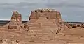 Mollys Castle is a geological feature set within the San Rafael Desert on the southeastern edge of the San Rafael Swell. This erosional remnant is composed of Jurassic rock. The thin, light-colored layer on top is Curtis Formation caprock, overlaying darker, reddish Entrada Sandstone, which is also the composition of the hoodoos that give Goblin Valley its name.[4][5]