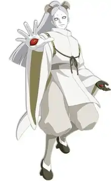 Momoshiki Otsutsuki is one of the two antagonists of Boruto: Naruto the Movie and a member of the main family of the Ōtsutsuki clan. A pale, androgynous man, he is a member of the Ōtsutsuki clan who was the reason Kaguya created the White Zetsu Army for, who comes to Earth to plant a new Shinju as the one he used is dying from using up its world's resources. Momoshiki possesses both a pair of Byakugan and Rinnegan, the latter located on his palms, which he uses to absorb and release ninjutsu. Targeting the Tailed Beasts for their chakra, attacking Killer Bee prior, Momoshiki and his partner Kinshiki come to Konohagakure with the objective of capturing Kurama from Naruto. The two manage to abduct Naruto to their dimension after destroying the Chunin Exams stadium, but before they could finish the extraction process, the pair are confronted by Boruto, Sasuke, and the four Kage. Overwhelmed, Momoshiki consumes a makeshift red pill from Kinshiki's body, making him even stronger with another Rinnegan appearing on his forehead. However, he is ultimately killed by Naruto and Boruto's combined Rasengan.[12]
