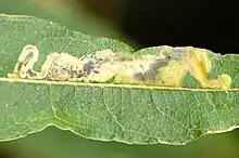 The oval eggs are laid on the surface of leaves, usually near the midrib. Larvae are yellow with a brown head and have a thoracic plate and an anal plate. They mine the leaves of rosebay willowherb (Epilobium angustifolium) causing a yellowish blotch on the leaves that bleach rapidly after the larvae leave them. The caterpillars occur in May to late July and late August to September They overwinter as a pupa and pupation occurs among detritus on the ground.[3][4]