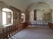 The Ex-monastery of Santiago Apóstol is located in the town of Cuilapan de Guerrero in the Mexican state of Oaxaca. The fortress-like complex is easily seen from the highway as one travels south from the capital city of Oaxaca on the road leading to Villa de Zaachila, and it is visited by both Mexican and international tourists. The complex is located on a small hill which gives it a view of much of the valley area.[1] It is one of the most extravagant and elaborate colonial era constructions in Oaxaca, but it is often overlooked in favor of churches and monasteries located in the Mexico City area.[2] Built of green quarried stone and river rocks, it is a quiet place where footsteps can echo in the hallways.[1] The extravagances of the site, including the tall basilica, the elaborate baptismal font, the Gothic cloister and murals remain as national treasures.[3] The decorative work of the monastery, especially its murals, are important because they show a systematic blending of indigenous elements into the Christian framework, done in order to support the evangelization process in the local Mixtec and Zapotec peoples.[4] The single-naved church is used for worship but the roofless basilica and cloister are under the control of INAH, which uses many of the second-floor rooms of the cloister as workshops for restoration projects and runs a small museum with important liturgical items from the 16th century.[5]