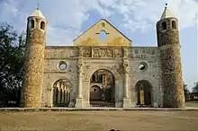 The largest structure is a rectangular unroofed basilica with elegant arches decorating its exterior facades.[18] The facade is Plateresque, with three arched entrances topped by a triangular pediment with a crest over that. In the center of the pediment, there is the coat of arms of the Dominican order with a dog to the side, symbolizing Saint Dominic of Guzman. Flanking the facade are two towers with circular bases topped with peaked cones.[8][14] The interior divides into three naves by heavy columns with Tuscan capitals, which were meant to support a complex Gothic roof.[8] These arcades of stone columns are mirrored by a series of doorless arched entrances on the eastern and western facades of the building.[19] This has led some to classify the building as an “open chapel,”[14] but the purpose of this unusual feature is not truly known.[19] The three nave design is also interesting as this had mostly gone out of fashion in other parts of Mexico in favor of single naved structures. No documents from that time explain why the older design was chosen[19] A plaque located inside has a mixture of Mixtec signs and the date 1555 written in Arabic script[8]