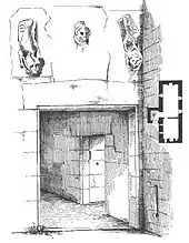 The commendator, Alexander Hamilton, became the Duke of Chatelherault, and under this French title he obtained the tower of Monkland,[7] later Monkcastle, from the last abbot, Gavin Hamilton. He also obtained Dalgarven, Auchenkist, and Birklands.[8] Monkcastle was a "part of the ancient halydom of Kilwinning, which about this time was beginning to be parcelled out by the Abbots, to whoever would best remunerate them for the ostensible gift, foreseeing that their own possession was becoming doubtful and unsteady." Alexander passed the property to Claud,[9] his third son, who became Commendator of Paisley, at the age of ten,[10] duly ratified and approved by Pope Julius III in 1553;[11] this may account for the mitred head which appears in a panel above the doorway, together with other sculptures,[12] typical of early 17th-century castles and also found at sites such as Barholm, Ardblair, and Dundarave.[13] Salter sees two of the carvings as being lizards with human heads[4] and Close and Riches see them as 'watchful dragons.[14] They appear to be more like head lice.