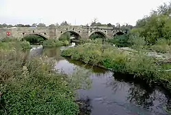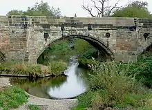 The bridge spans the River Dove and provides a crossing between the parishes of Stretton, Staffordshire and Egginton, Derbyshire.[1] It is a stone bridge with four arches, founded in the river on cutwaters, and with triangular bastions (outwards projections of the deck and parapet) at the piers.[2][3] Each arch spans approximately 10 metres (33 ft) and the bridge is around 6.1 metres (20 ft) wide. The arches, except for the westernmost, are ribbed. The piers are founded on spread foundations supplemented with timber piles. The arch spandrels are supported by tie rods with anchor plates.[4]: 3