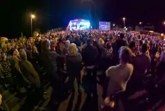 The main performances take place on an outdoor stage which for the last few years has been sited during the festival week in the large car park at the bottom of the town, between the ancient gatehouse and new bridges. Previously it was sited in the centre of the town, in front of the Shire Hall.
