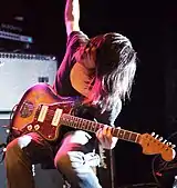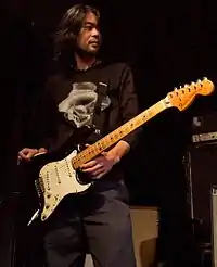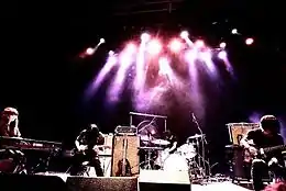 In terms of instrumentation, Mono is a four-piece instrumental rock band. Goto, the group's lead guitarist, uses a 1966 Fender Jazzmaster through Boss, Danelectro, SiB, and Morley effects pedals, into a Fender Twin, a Marshall JCM 2000 head, and a Marshall cabinet for amplification.[30] Yoda, the rhythm guitarist, uses a 1974 Fender Stratocaster through Boss, Tech 21 and Pro Co effects pedals, into a Fender Twin for amplification.[30] Kunishi, the group's bass guitarist, pianist and occasional guitarist uses a 1966 Gibson EB-3 through Boss, TC Electronic, and Tech 21 effects pedals, into an Ampeg B2-R head and a Sunn bass cabinet, as well as a Fender Rhodes, and a Fender Jazzmaster.[30] Takada, the drummer, uses a four-piece 1970s Ludwig drum kit, with Zildjian, Sabian, and Paiste cymbals, as well as a Korg microKORG synthesizer.[30]
