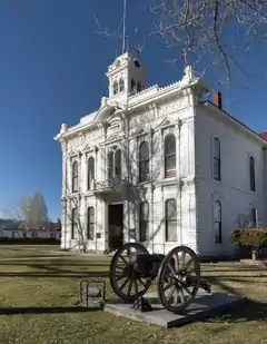 In 1863, a detailed survey concluded that Aurora was in the Territory of Nevada instead and after it was named the seat of Esmeralda County, Nevada, the county seat was moved to Bridgeport by election in 1864.[3]: 240–243 The county records were hauled from Aurora to Bridgeport and stored in Kingsley's Inn, which served as the first county courthouse.[4] The 2-1⁄2 story Mono County Courthouse was completed in 1880, designed by J.R. Roberts and built by Charles Anton, Samuel Hopkins, and James Cain.[4][5] The 1880 courthouse is still serving its original purpose as the north branch courthouse for the county,[6] and is among the oldest operating courthouses in California.[7] An annex was built in 1974.[8]