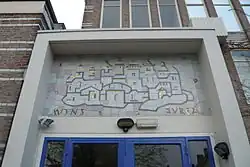 When the law for compulsory education (leerplicht) was passed in 1900 for children aged 6–12, the first local school for girls called Eerste Haarlemsche Huishoud- en Industrieschool was opened in 1901, just around the corner from the Ambachtsschool for boys on the Kamperstraat.[3] The "Huishoud school" offered a three-year education and "extra classes". Some of the "extra class" names in the Household school were ‘nat en droogwaschen’ (wet and dry-cleaning), ‘strijken’ (ironing), ‘tafeldienen’ (waiting tables), ‘naaien van lijfgoed’ (sewing underwear) and ‘koken' (cooking) for workmen's wives. The extra classes were paid separately. For example the cooking class for children cost 1 guilder and fifty cents, but the meal could be eaten afterwards. The school was very popular, and a Catholic girls school was opened nearby on the Kleine Houtweg in 1914 called the R.K. Meisjes School. A catholic "huishoud school" was started in the same building in 1919, but moved to the Gedempte Voldersgracht where it stayed until 1960, when the current site at the Garenkokerskade was built. It was built in 1960 by architect Jan van der Laan (1896–1966) and partners Th. M. van der Eerden, J. B. Hermans en J. H. M. Kirch.[4]
