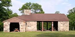 Originally the 2-acre (0.81 ha) park was privately owned by the Monson Lake Memorial Association. During the Great Depression, the Franklin D. Roosevelt administration funded public works projects to ease unemployment, and park development was a significant focus. To this end, in 1935 the Association convinced the Minnesota Emergency Relief Agency to purchase and expand the park. The Veterans Conservation Corps—a branch of the Civilian Conservation Corps for unemployed World War I veterans—had a major camp at nearby Sibley State Park, so a side camp was established at Monson Lake in 1936. The VCC men constructed a Sanitation Building and a Combination Building (a picnic shelter with a public cooking area and space for a concession service). These were built in the National Park Service rustic style with local granite and white oak. Crews from the Works Progress Administration created the gravel entrance road and parking lot. Monson Lake Memorial State Park, as it was originally named, was dedicated in 1938.[6] Since it was designated a memorial state park, only limited recreational facilities were built.[2]