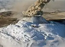 A rock from Horsburgh Point yielded an age of 1,000,000 ± 300,000 years by potassium-argon dating.[33] Before 1990, there was no indication of any historical or Holocene activity at Montagu.[34] Other seabirds and seals occasionally come ashore on the island.[35] This probably reflects its remote location and extensive ice cover.[5] Landing parties likewise did not document any heated ground or fumarole activity.[29] Eruptions of low intensity may have taken place between 1995 and 1997.[2]