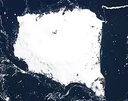 With dimensions of 10 by 12 kilometres (6.2 mi × 7.5 mi), Montagu is the largest of the South Sandwich Islands.[2] It consists of an eroded[8] mostly ice-covered shield volcano.[9] The island has a roughly rectangular outline, with a promontory on the southeastern corner. There rises the 900 metres (3,000 ft) high[10] steep-sided Mount Oceanite with a 270 metres (890 ft) wide and 100 metres (330 ft) deep summit crater,[5] and a landslide scar to the east.[11] Capes on the island include the northern Poncet Point which formed during the 2001–2007 eruption,[12] northeastern Leeson Point, eastern Mathias Point just east of Mount Oceanite, Allen Point southeast of Mount Oceanite, southern Scarlett Point, southwestern Horsburgh Point and Hollow Point and northwestern Borley Point. Several small islets lie around the island, including Longlow Rock just off the western coast.[5] Rocky outcrops are limited to coastal cliffs,[5] which alternate with ice falls.[13]