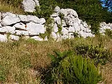 The walls are constituted of large, dry-laid stone boulders. The most well-preserved part runs along the southern part of the mountain away from the paths.