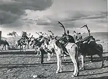 Wild boars and Iberian red deer are the most common species to be hunted in this type of montería, but also other species such as fallow deer, mouflon and formerly wolf and lynx.[16] In a forest or patch of several hundred hectares a series of so-called "armadas" or lines of positions with shooting pegs, are arranged to surround and cover the mancha. Depending on their particular location in it, the armadas are called by various names ("cuerda" is the highest; "sopié" the lowest; "traviesa" is the one that crosses or is generally found in the middle of the area). From a certain end, or from more than one, the rehalas are released, and led by their respective beaters. They will beat the area in different directions with the ultimate aim of moving the game towards the hunting pegs.[15]