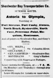 - 1 2 Advertisement, “Shoalwater Bay Transportation Co.”, Daily Astorian, August 17, 1882, page 3, col. 7.