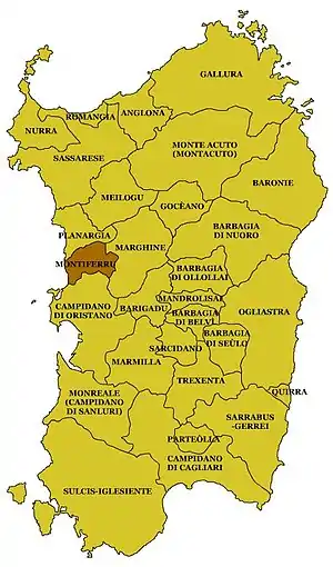 Montiferru is a historical region of central-western Sardinia, Italy. It takes its name from the eponymous extinct volcano massif, whose main peak is the Monte Urtigu (1,050 m). Extending for some 700 km², the massif had originally a maximum elevation of c. 1,600/1,700 m, later reduced due to erosion.