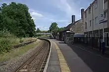 Facilities at the station are minimal – there are a few chairs and timetable information is provided. There are help points on the platform, giving next train information and allowing passengers to contact staff. There is no ticket office, though a self-service ticket machine was installed in 2022.[2] The station building is used as a workshop and showroom for a company selling fireplaces,[9] and is bricked up on the platform side. It is, however, colourfully decorated with a mural, painted as a collaborative effort between the Severnside Community Rail Partnership and local schools. The Severnside CRP also tend the station's garden in conjunction with the nearby Montpelier High School.[10][11][12] There is no car park or taxi rank, but there are bus stops on Cromwell Road, and more on the busy A38 Cheltenham Road roughly 400 yards (370 m) away.[2][13] Cycle storage is available on the platform.[2]